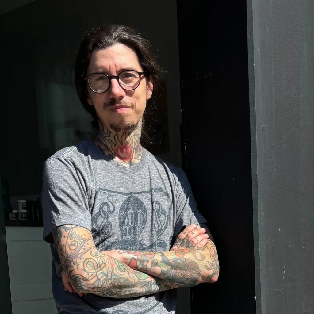 Buie is a Tennessee transplant and general connoisseur of almost all things nerdy. Anime, comics, and science fiction are all passions of his, though he is versed in various different tattoo styles and is always open to a wide array of client design ideas. Buie’s work is generally full of bold lines and bright colors, with a lot of work in traditional Japanese, pen and ink, and fun mashups of monsters and pop culture. Outside of work, Buie enjoys woodworking, tinkering on bikes, exploring the outdoors, and hanging out at home with Pamy and the pup pack. Indoors, he also likes to spend free time studying up on traditional manga and Japanese works. He is a big fan of cartoons and comics and it shows in his work. Buie is always happy to mix it up and create fun and interesting combinations in his work, be it nerdy or natural, anime or anatomical, and welcomes challenges and trust given to him by his clients. Send him a DM on Instagram or email him for scheduling.